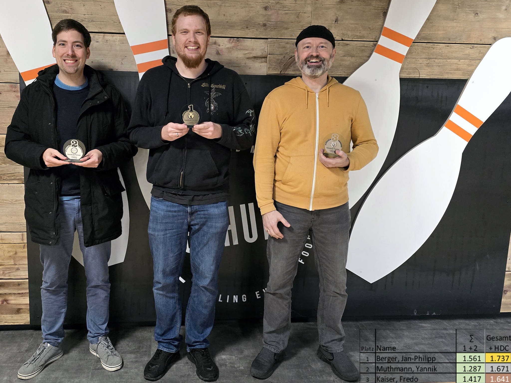 während die 13. Deutschen Betriebssport Meisterschaft 2026 im Bowling für Trio-Mannschaften, vom 8. bis 11. Januar 2026 in Lübeck nicht so richtig erfolgreich für uns verlief - von den drei Teams mit BSVO-Teilnehmern, die sich für das Stepladder-Final qualifiziert hatten, war bereits nach jeder der ersten Spielpaarung Schluss - konnte uns bei unserem Handicap-Turnier in dieser Woche keiner die Show stehlen da hier nur BSVO-Mitglieder teilnahmeberechtigt waren. 😊 Insbesondere unsere 'jungen Wilden' wussten zu überzeugen und J.P. hätte sogar ohne Handicap den ersten Platz belegt. Allen Teilnehmern danke ich für ihr Mitwirken und hoffe, dass es euch ebenfalls viel Spaß gemacht. Alle Ergebnisse können weiter unten, unter "Spielplan und Ergebnisse" eingesehen bzw. abgerufen werden. |